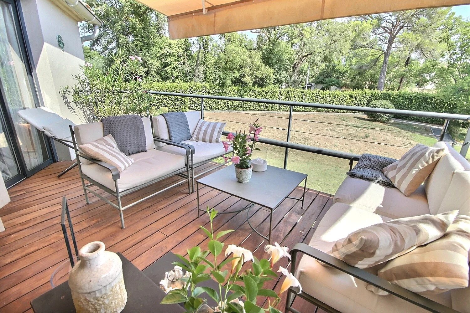 Vardagsrummet och matsalen öppnar upp mot två rymliga terrasser med fantastisk utsikt över naturen och den gemensamma poolen.